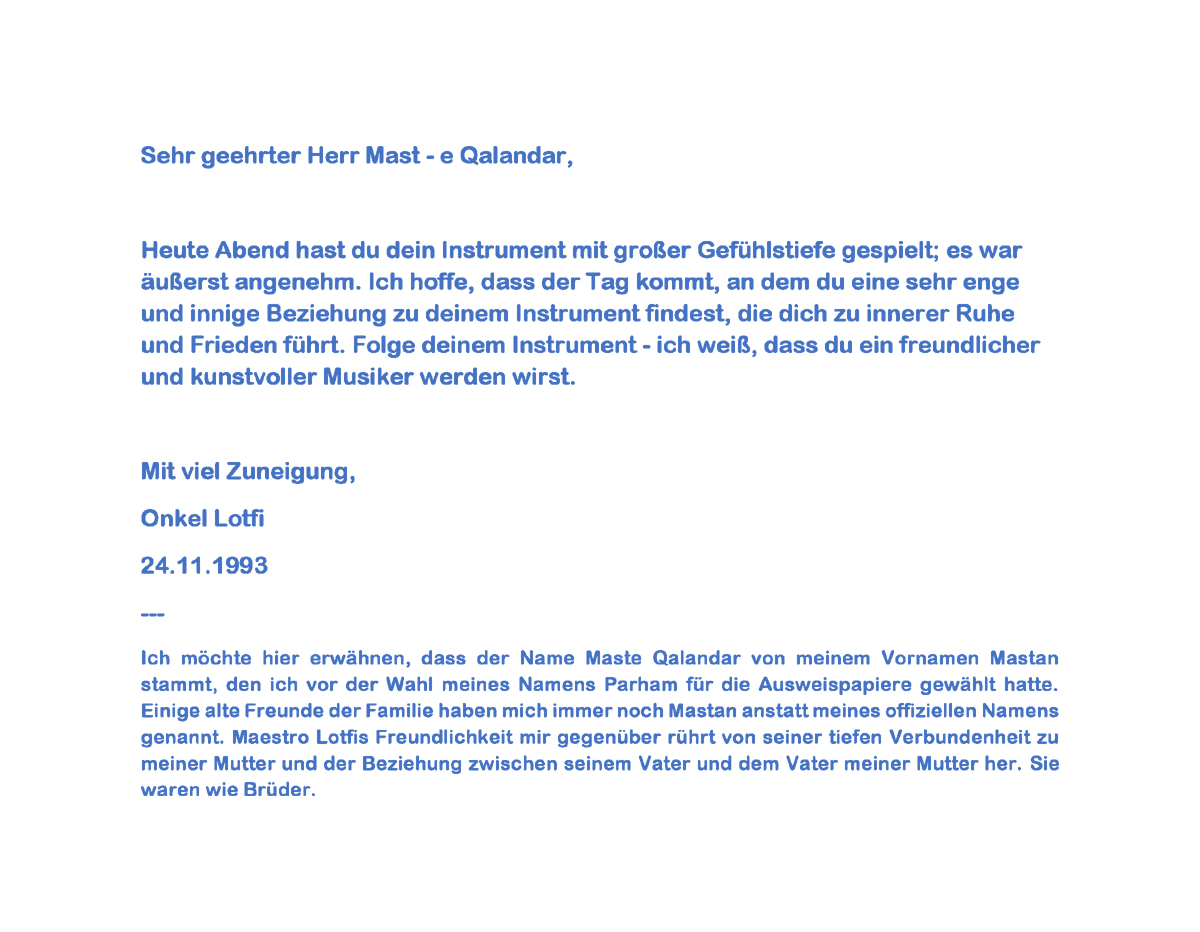 "Ich hatte lange nach einem Setar - Lehrer gesucht und bin froh Parham gefunden zu haben. Der Unterricht über Skype funktioniert überraschend gut und es fallen keine unnötigen Fahrzeiten an. Ich war blutiger Anfänger und kann nun schon ganz gut spielen und habe natürlich auch viel über persische Musik gelernt. Tolle Sache!"